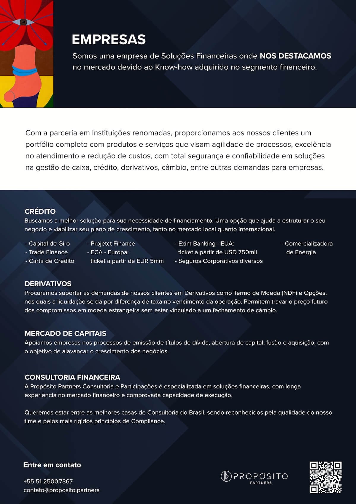 Em parceria com renomadas instituições, proporcionamos aos nossos clientes um portfólio completo de produtos e serviços que visam excelência no atendimento, agilidade de processos e redução de custos, com total segurança e confiabilidade em soluções na gestão de caixa, crédito, derivativos, câmbio, entre outras demandas para empresas.
